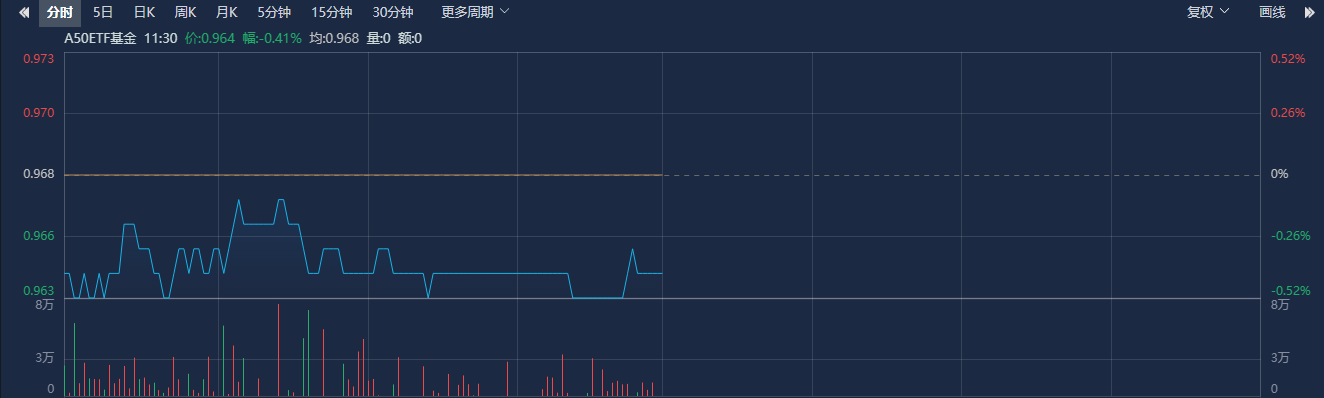 相关ETF方面,A50ETF基金(159592)截至早间收盘下跌0.41%,成交额1.38亿元,换手率3.73%,早盘交投活跃,频现溢价交易。