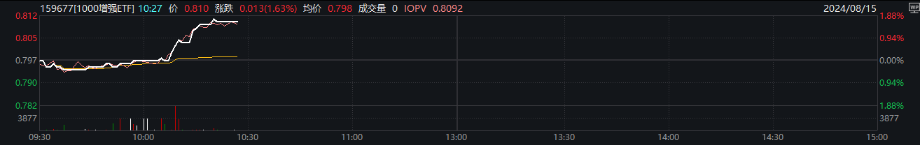 相关ETF方面,1000增强ETF(159677)现涨1.63%,溢折率0.10%,早盘频现溢价交易。成分股中,华灿光电“20CM”涨停,东软载波涨超17%,深圳华强、创维数字涨停,宝通科技、京新药业、锋尚文化、航锦科技均涨超6%。
