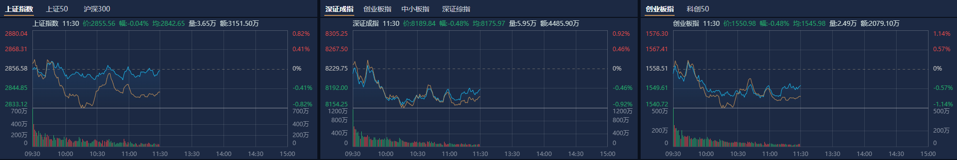 市场早盘震荡调整,沪指相对偏强。南财金融终端显示,截至早盘收盘,沪指跌0.04%,深成指跌0.48%,创业板指跌0.48%。总体上个股跌多涨少,全市场超3600只个下跌。