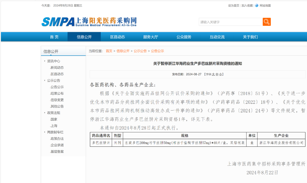 8月27日,上海阳光医药采购网发布关于暂停浙江华海药业生产多巴丝肼片采购资格的通知。根据相关规定,暂停华海药业生产的多巴丝肼片采购资格1年,通知自8月28日起正式执行。