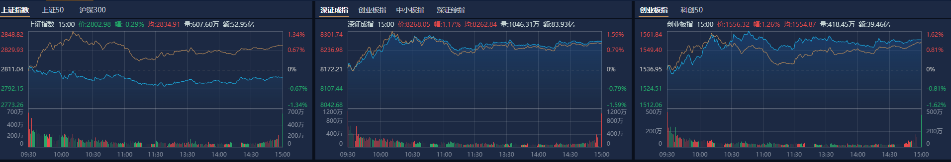 市场全天震荡分化,深成指、创业板指反弹,沪指盘中一度跌破2800点,银行等高位红利股集体调整。南财金融终端显示,截至收盘,沪指跌0.29%,深成指涨1.17%,创业板指涨1.26%。