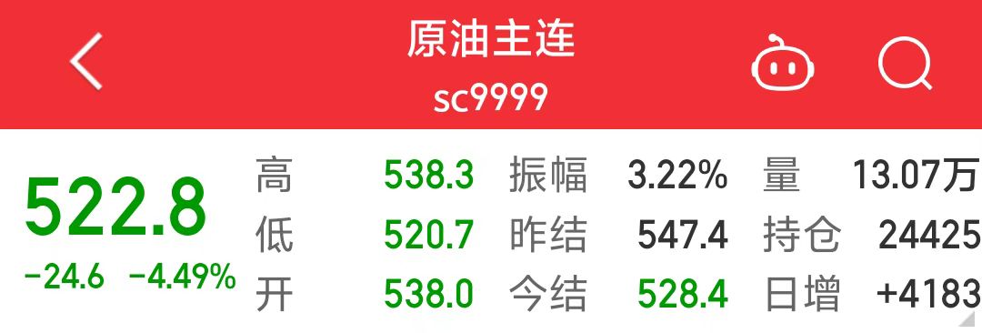 9月4日,油气股和原油期货均大幅下跌。原油主连收跌4.49%,报522.8元/桶。A股个股中,中曼石油(603619.SH)跌6.2%,中国石油(601857.SH)、中国海油(600938.SH)跌超5%。