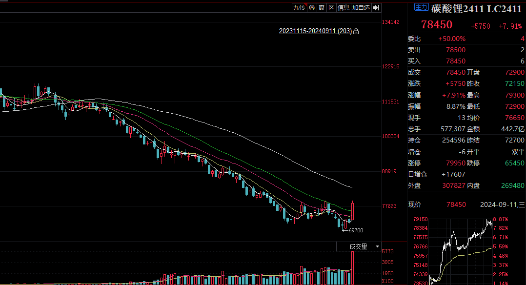 9月11日,碳酸锂期货迎来反弹。截至收盘,碳酸锂期货主力合约大涨7.91%,报78450元/吨。值得注意的是,碳酸锂所有合约持仓量创历史新高,总持仓量首次突破40万张。