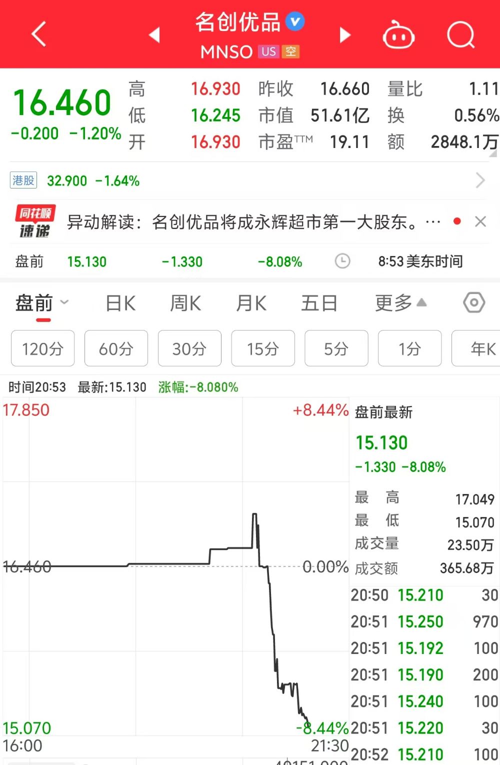 截至北京时间20时53分,名创优品美股盘前跌8.08%,报15.13美元/股。