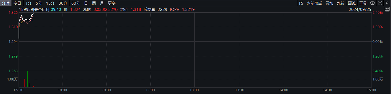 相关ETF中,央企ETF(159959)高开高走,截至发稿上涨2.32%,溢折率0.20%,盘中频现溢价交易。资金流向上,Wind数据显示,该ETF昨日获资金净流入超4000万元。