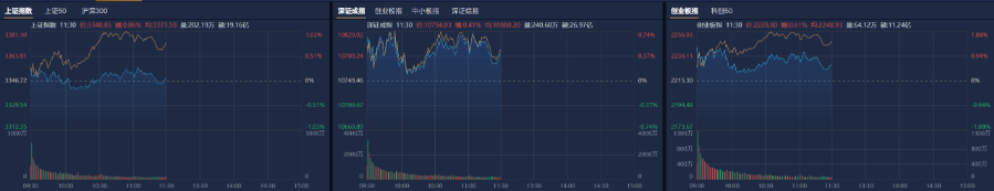 市场早盘冲高回落,三大指数小幅上涨。南财金融终端显示,截至早盘收盘,沪指涨0.06%,深成指涨0.41%,创业板指涨0.61%。