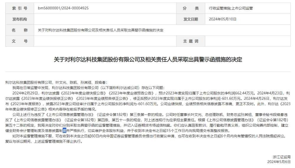 浙江证监局认为,利尔达业绩快报、业绩预告相关信息披露不准确、更正不及时。此外,利尔达《2023年年度业绩快报修正公告》相关内容存在前后矛盾的情况。