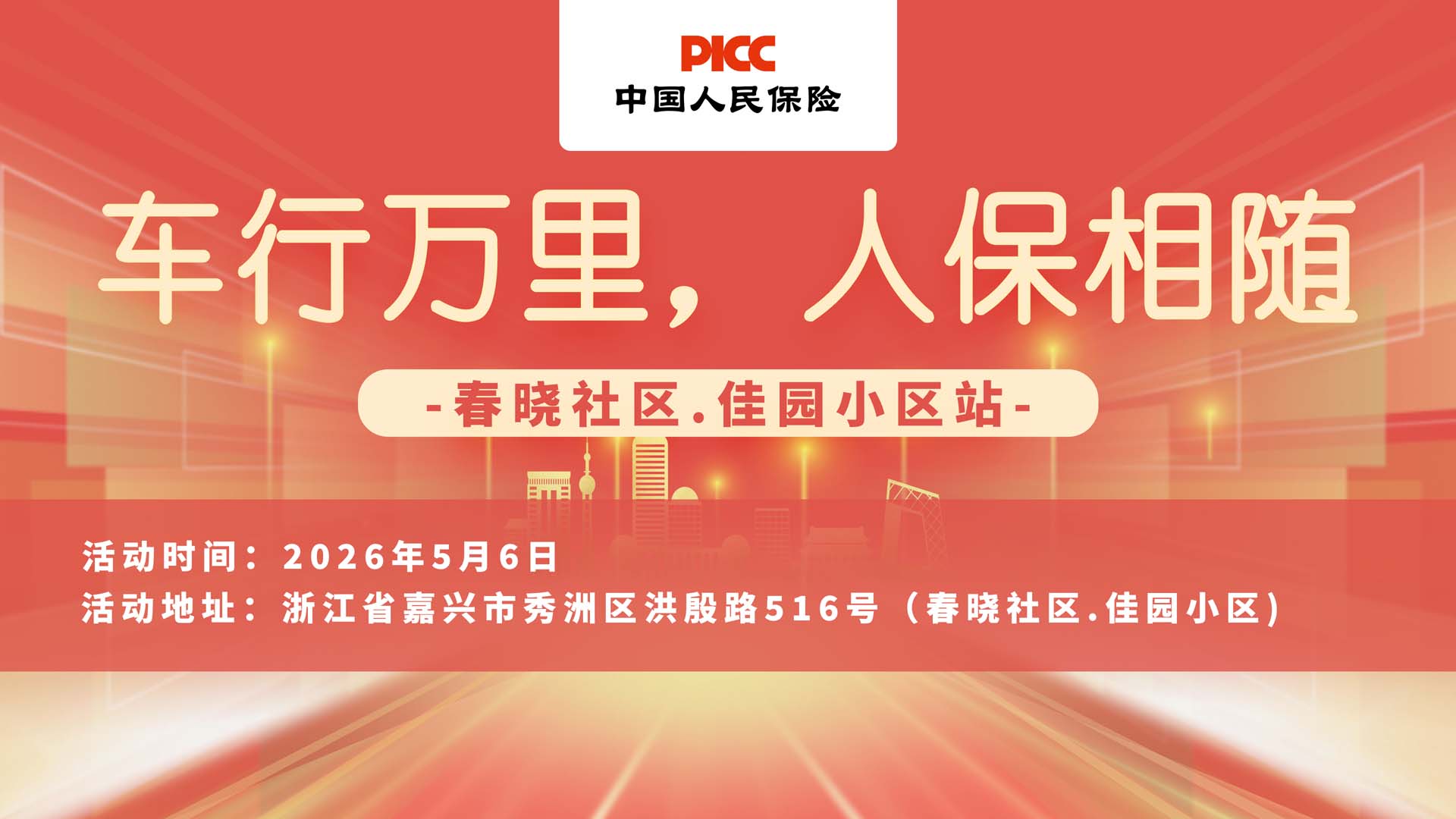 2026年5月6日,中国人民财产保险股份有限公司嘉兴市秀洲支公司将走进春晓社区.佳园小区,开展“车行万里,人保相随”专项活动。活动现场,专业保险顾问将提供一对一免费咨询,详细解读车险条款、测算续保费用、分析保障缺口,针对新车车主、老司机、新能源车主等不同群体定制专属保障计划,让您投保更清晰、用车更安心。