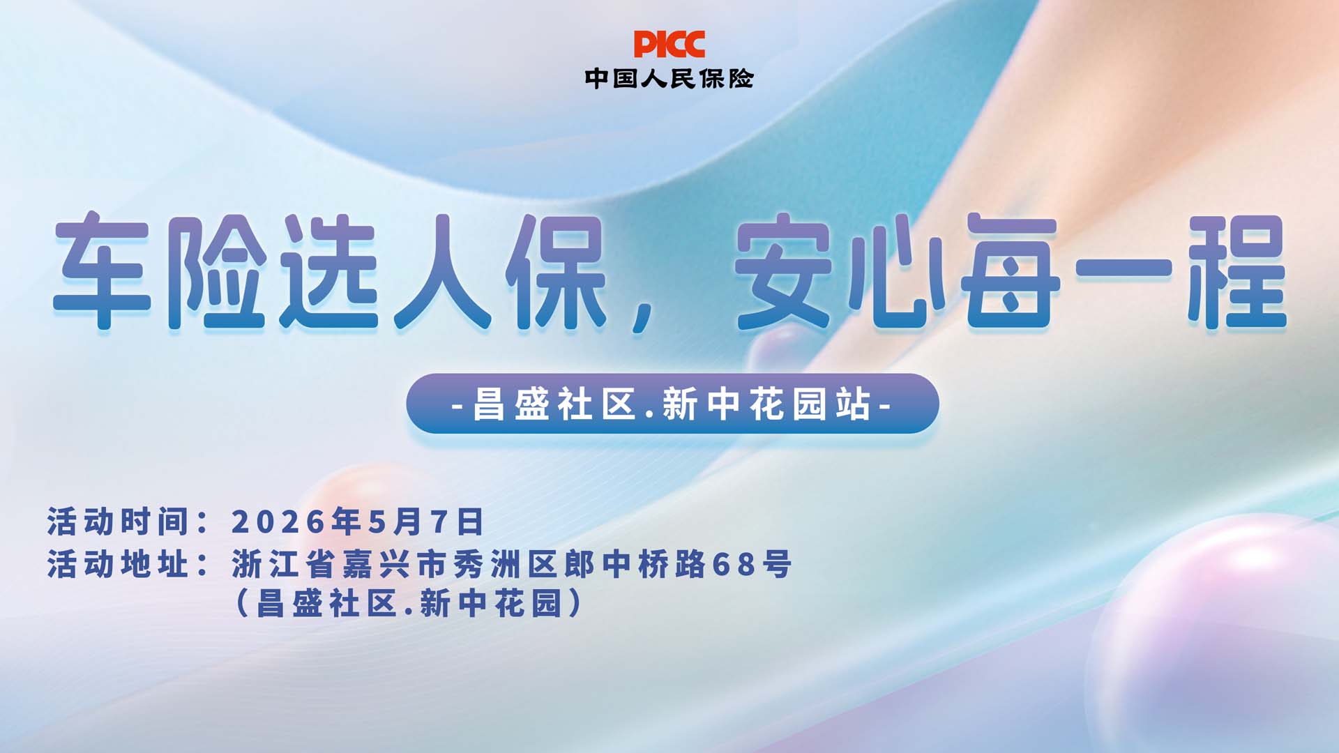 2026年5月7日,中国人民财产保险股份有限公司嘉兴市秀洲支公司将走进昌盛社区.新中花园,开展“车险选人保,安心每一程”专项活动。活动现场,专业保险顾问将提供一对一免费咨询,详细解读车险条款、测算续保费用、分析保障缺口,针对新车车主、老司机、新能源车主等不同群体定制专属保障计划,让您投保更清晰、用车更安心。