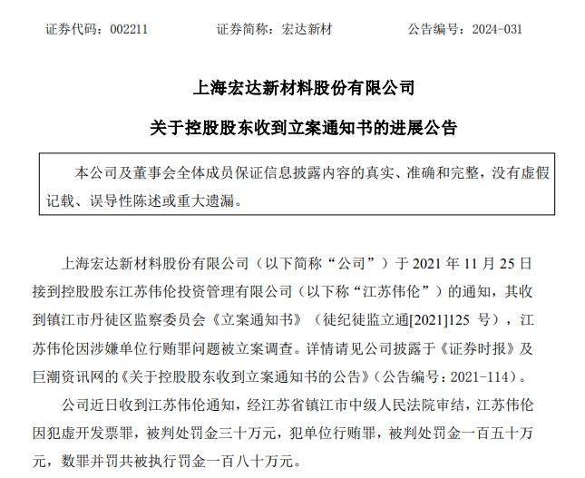 2024年6月12日,宏达新材发布公告称,公司近日收到控股股东江苏伟伦通知,经江苏省镇江市中级人民法院审结,江苏伟伦因犯虚开发票罪,被判处罚金三十万元,犯单位行贿罪,被判处罚金一百五十万元,数罪并罚共被执行罚金一百八十万元