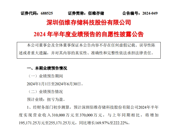 佰维存储公告称,预计2024年半年度实现营业收入31亿元至37亿元,同比增长169.97%至222.22%。预计上半年归母净利润为2.8亿元至3.3亿元,同比扭亏为盈。上年同期,实现营业收入11.48亿元;归母净利润为-2.96亿元。