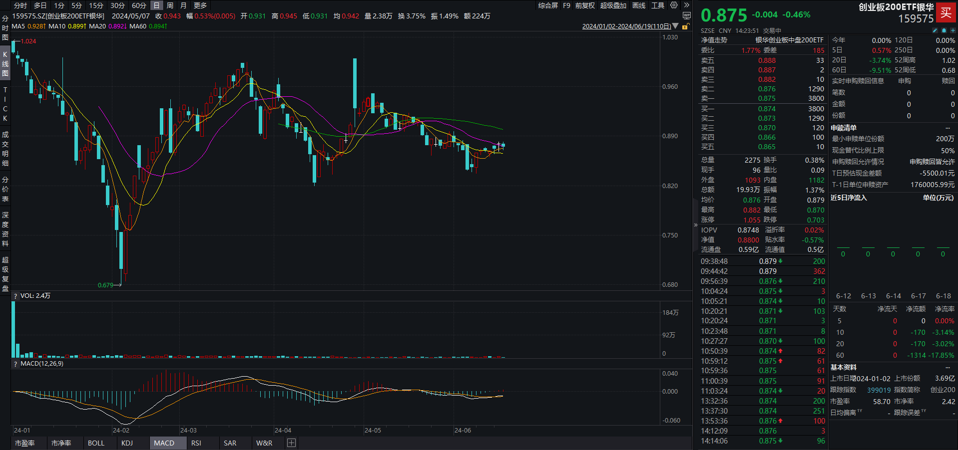 相关ETF方面,创业板200ETF银华(159575)现跌0.46%,盘中频现溢价交易,溢折率为0.02%,换手率为0.38%。