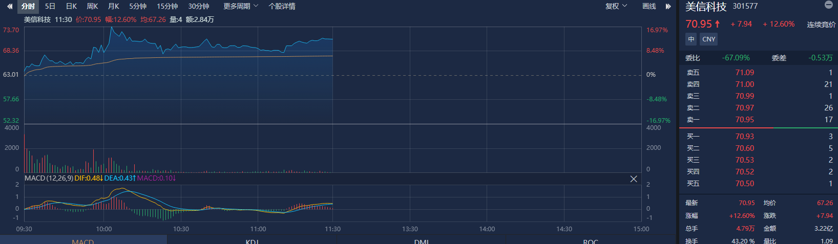6月19日,一体成型电感概念持续走强,部分相关个股大涨。6月20日,一体成型电感概念延续涨势,截至午间收盘,美信科技涨12.60%,报70.95元/股,麦捷科技涨4%,铂科新材张1.10%。