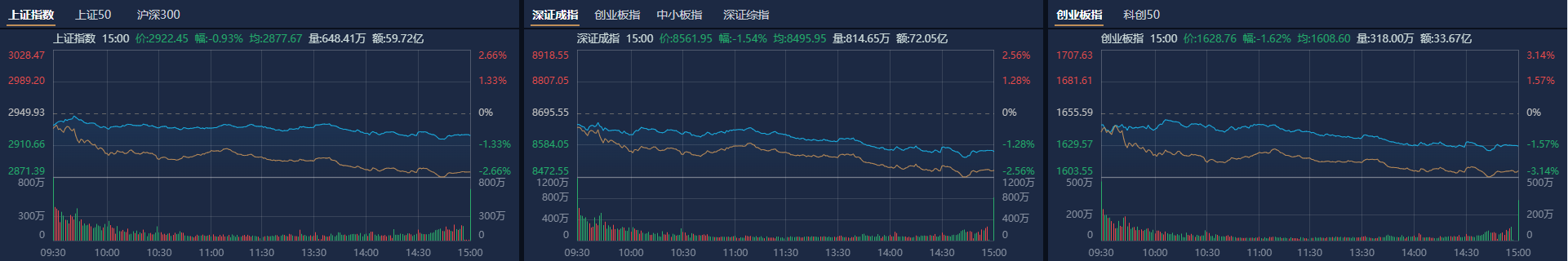 市场全天低开低走,创业板指领跌。南财金融终端显示,截至收盘,沪指跌0.93%,深成指跌1.54%,创业板指跌1.62%。总体上个股跌多涨少,全市场超4800只个股下跌。