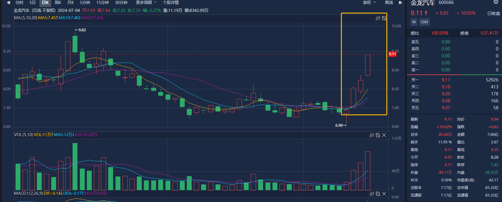 无人驾驶板块走强,其中金龙汽车涨停,截至发稿,金龙汽车涨10.02%,报9.11元/股,成交额为7.66亿元。值得注意的是,金龙汽车近期持续放量上涨,7月9日至7月12日,金龙汽车涨幅高达26.53%。