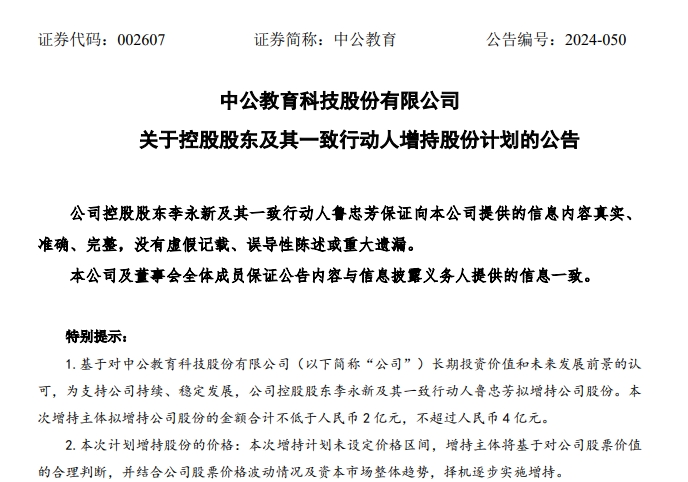 中公教育公告,公司控股股东李永新及其一致行动人鲁忠芳拟增持公司股份,拟增持金额合计不低于人民币2亿元,不超过人民币4亿元。