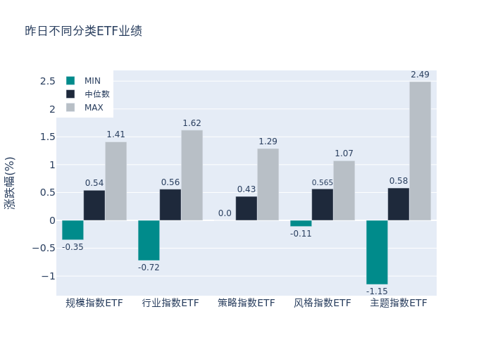 昨日股票型ETF收益率中位数为0.56%。其中按照不同分类,规模指数中华安创业板50ETF收益率最高,为1.41%;行业指数中南方中证全指电力公用事业ETF收益率最高,为1.62%;策略指数中华夏创业板低波价值ETF收益率最高,为1.29%;风格指数中嘉实医药健康100ETF收益率最高,为1.07%;主题指数中国防ETF收益率最高,为2.49%。