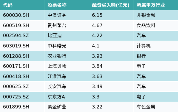 7月23日,两市共有3350只个股有融资资金买入,其中中信证券、贵州茅台、比亚迪排名前三,买入金额分别为6.15亿元、4.67亿元、4.22亿元。融资买入额前10个股详情见下表: