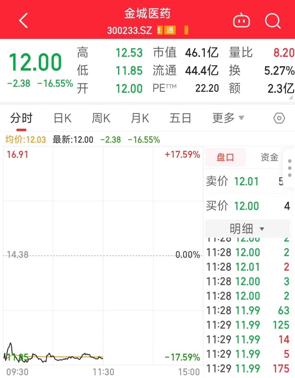 8月19日,截至午间收盘,金城医药大跌16.55%,报12.00元/股。
