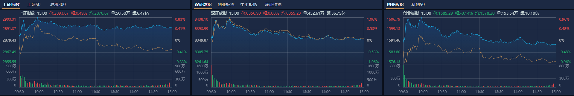 市场全天冲高回落,三大指数涨跌不一。南财金融终端显示,截至收盘,沪指涨0.49%,深成指涨0.08%,创业板指跌0.14%。