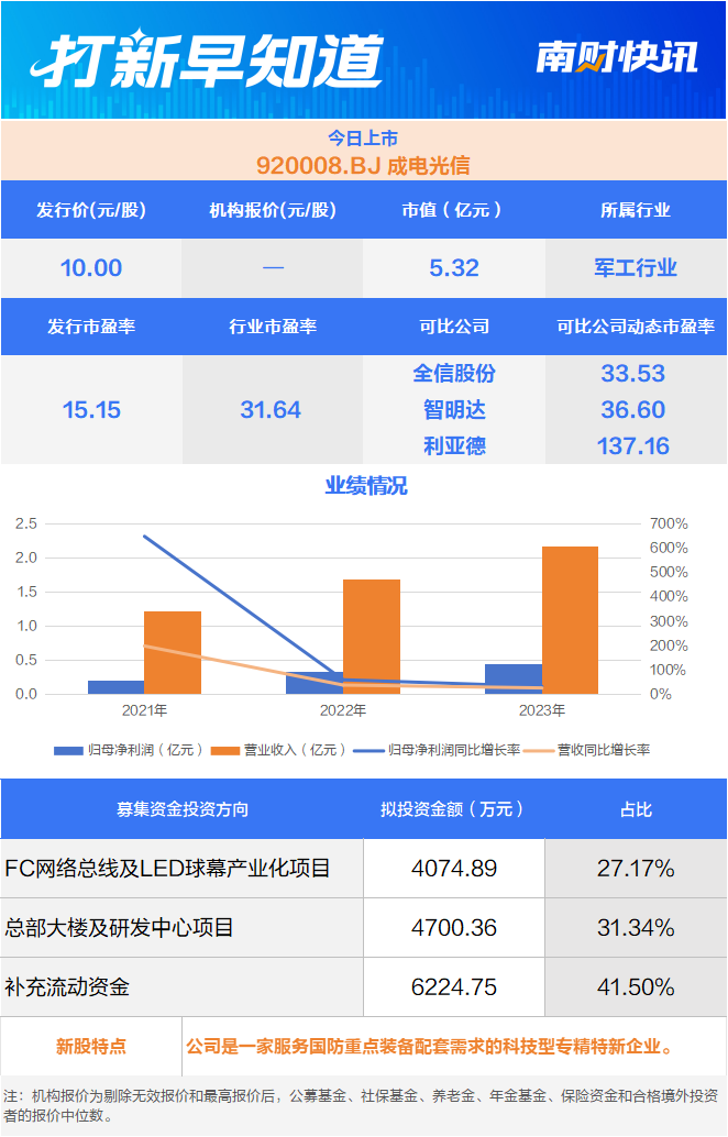 8月29日,成电光信(920008.BJ)在北交所上市,该公司主要从事网络总线产品和特种显示产品的研发、生产及销售,产品目前主要应用于国防军工领域。