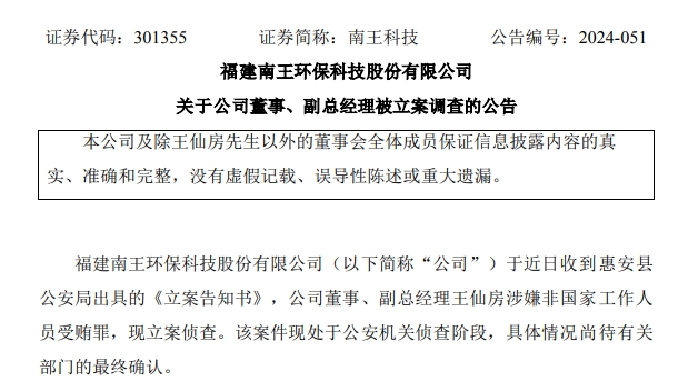 9月3日晚间,南王科技(301355.SZ)公告称,于近日收到惠安县公安局出具的《立案告知书》,公司董事、副总经理王仙房涉嫌非国家工作人员受贿罪,现立案侦查。
