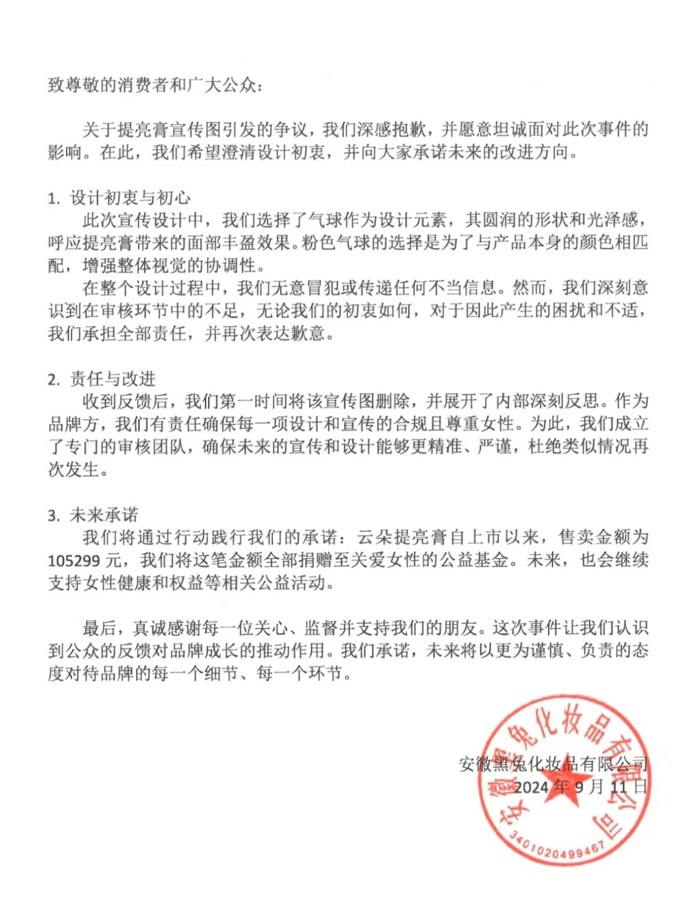 黑兔还补充道,公司成立了专门的审核团队,杜绝类似情况再次发生,并承诺将旗下产品云朵提亮膏自上市以来所售的105299元金额,全部捐赠至关爱女性的公益基金。