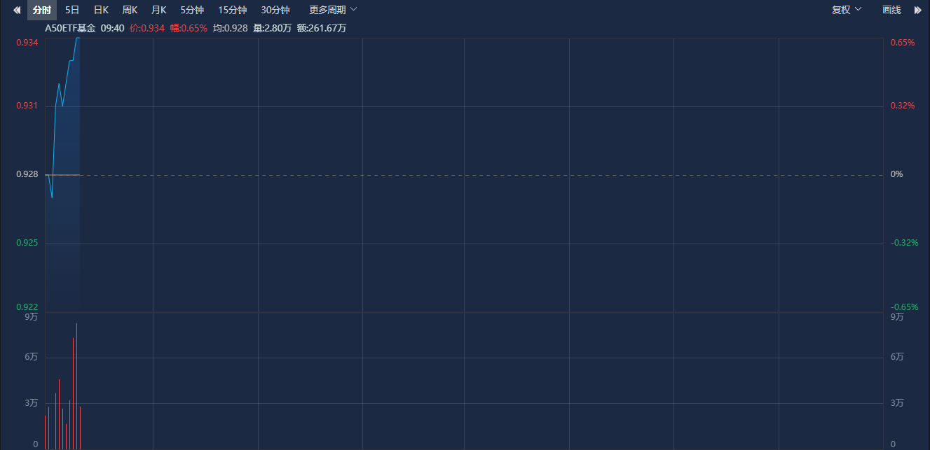 相关ETF方面,A50ETF基金(159592)盘中持续走强,截至发稿上涨0.65%,成交额超3300万元,换手率近1%,交投活跃。