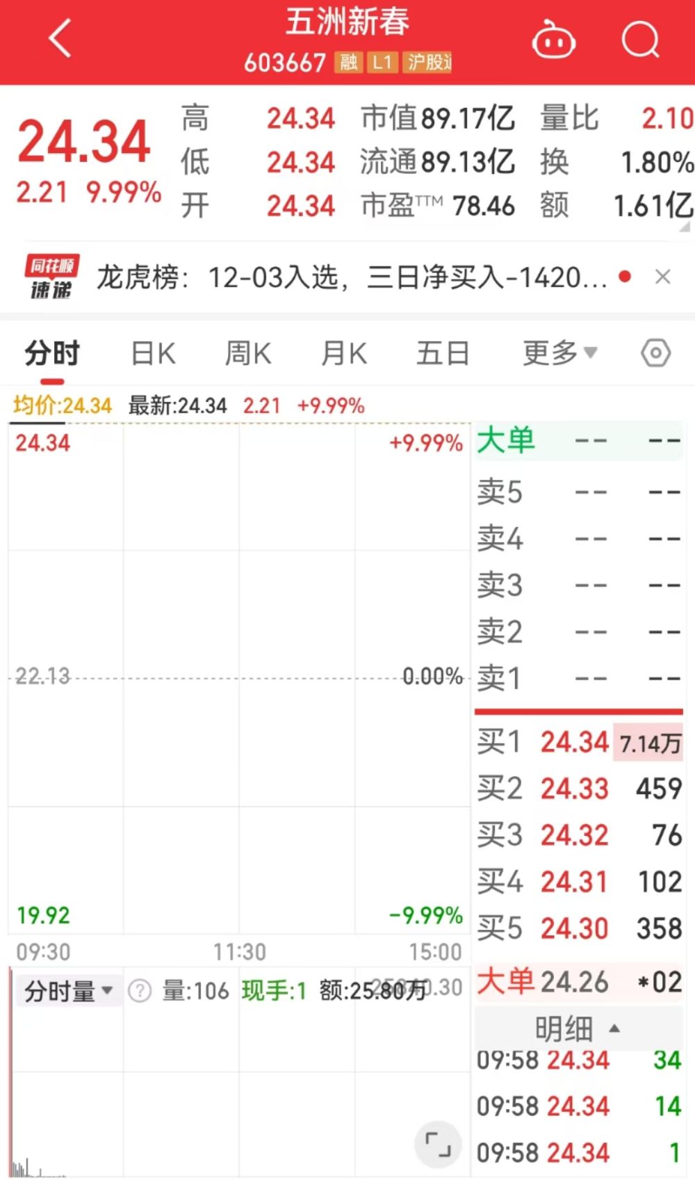 12月4日,五洲新春(603667.SH)开盘一字涨停,实现四连板,最新股价为24.34元/股,总市值89.17亿元。
