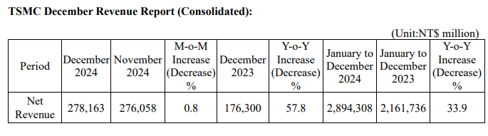 1月10日,台积电(TSM.US)官网发布2024年12月营收报告。2024年12月销售额2781.63亿元新台币,环比增长0.8%,同比增长57.8%。1-12月累计销售额2.89万亿元新台币,同比增长33.9%。