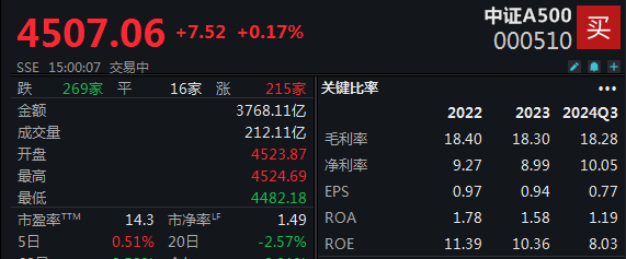 中证A500指数(000510.SH)收涨0.17%,报4507.06点。成分股中,有215家上涨,其中有14家涨超5%。