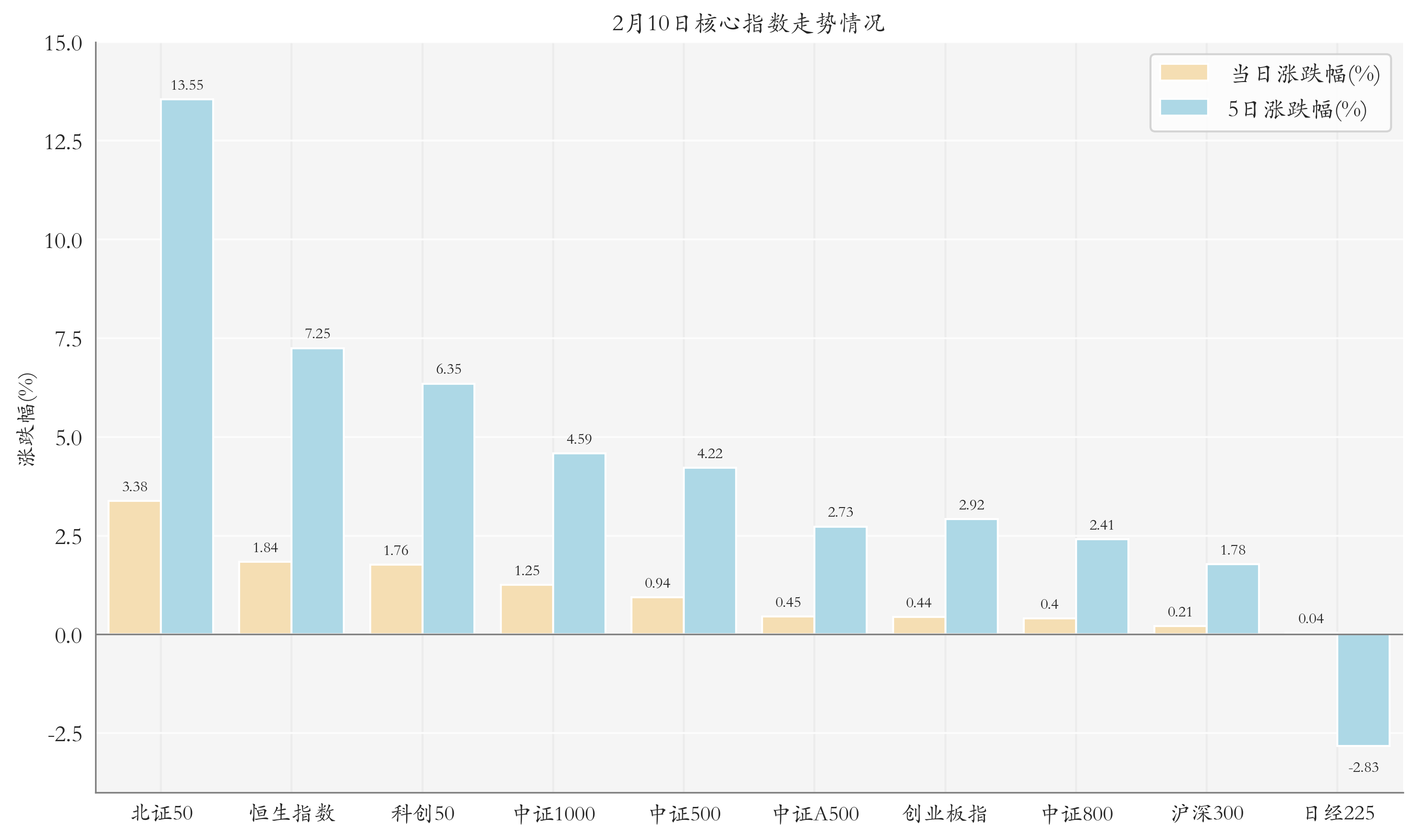统计A股与海外主要核心指数走势,今日(2月10日,下同)三大指数集体上涨,其中上证指数上涨0.56%,收于3322.17点,日内最高3325.36点;深证成指上涨0.52%,收于10631.25点,日内最高10645.96点;创业板指上涨0.44%,收于2183.88点,日内最高2188.13点。今日北证50、恒生指数与科创50走势排名靠前,日涨跌幅分别为3.38%、1.84%与1.76%;近5个交易日北证50、恒生指数与科创50的走势排名靠前,近5日涨跌幅分别为13.55%、7.25%与6.35%。