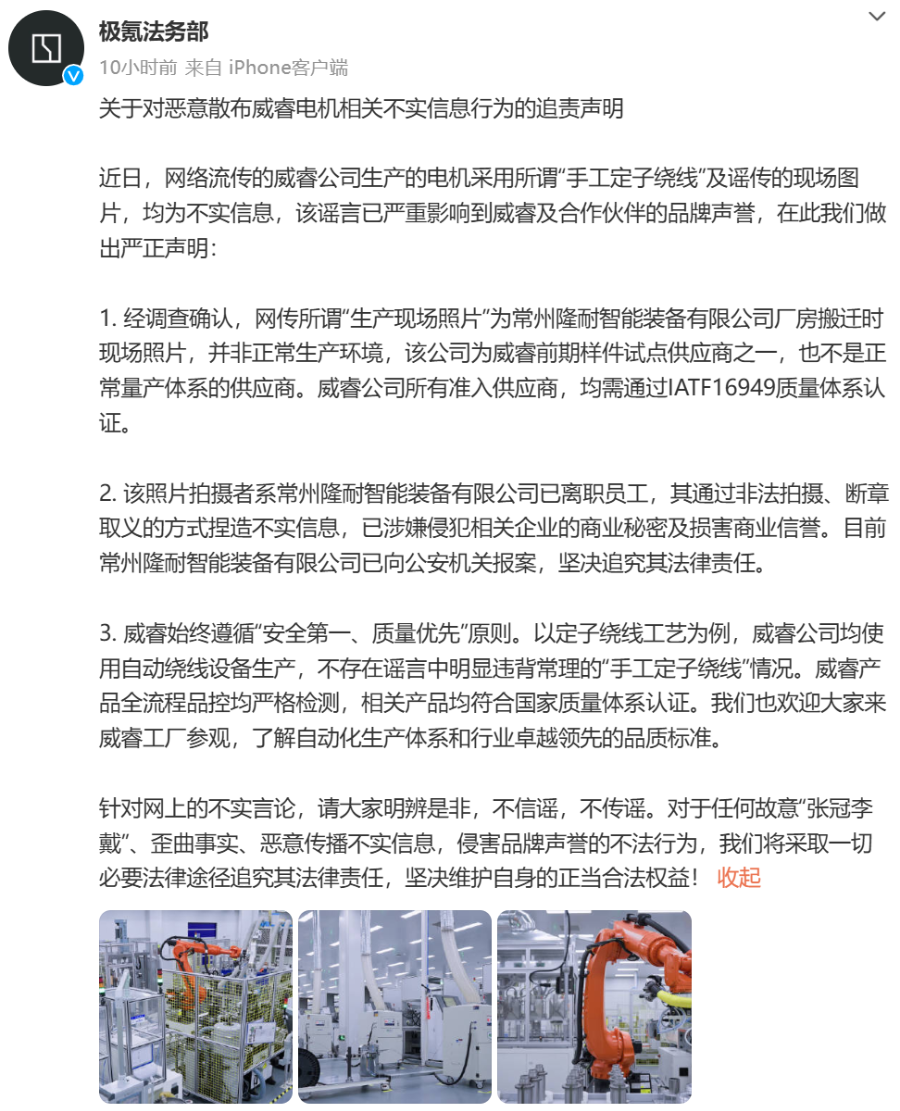 极氪法务部表示,以定子绕线工艺为例,威睿公司均使用自动绕线设备生产,不存在谣言中明显违背常理的“手工定子绕线”情况。