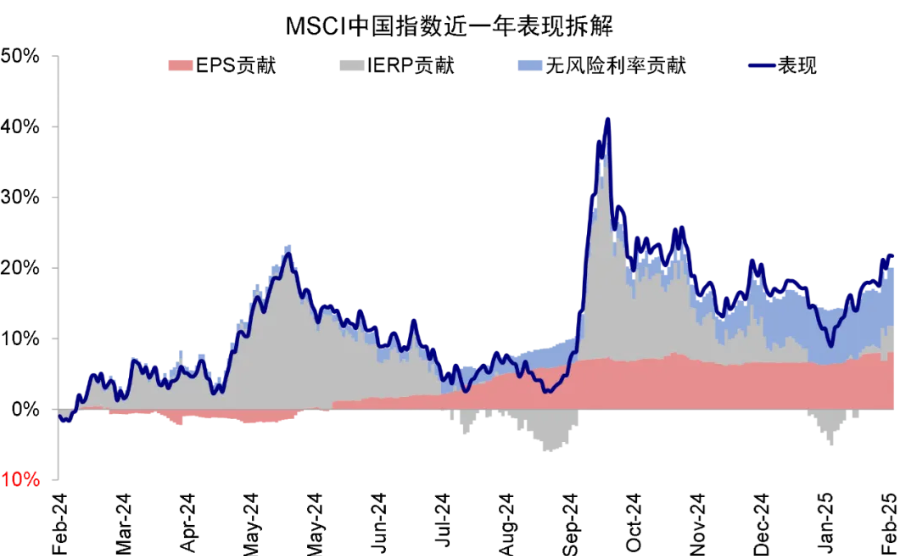 其中,情绪推动风险溢价回落是主要驱动力。1月中旬以来MSCI中国指数超过10%的涨幅中,盈利贡献仅为1.7%,估值扩张则贡献了8.8%占绝大部分。进一步拆解后可以发现,风险溢价回落贡献了8.3%,无风险利率仅小幅贡献0.5%,说明情绪是主要驱动力。