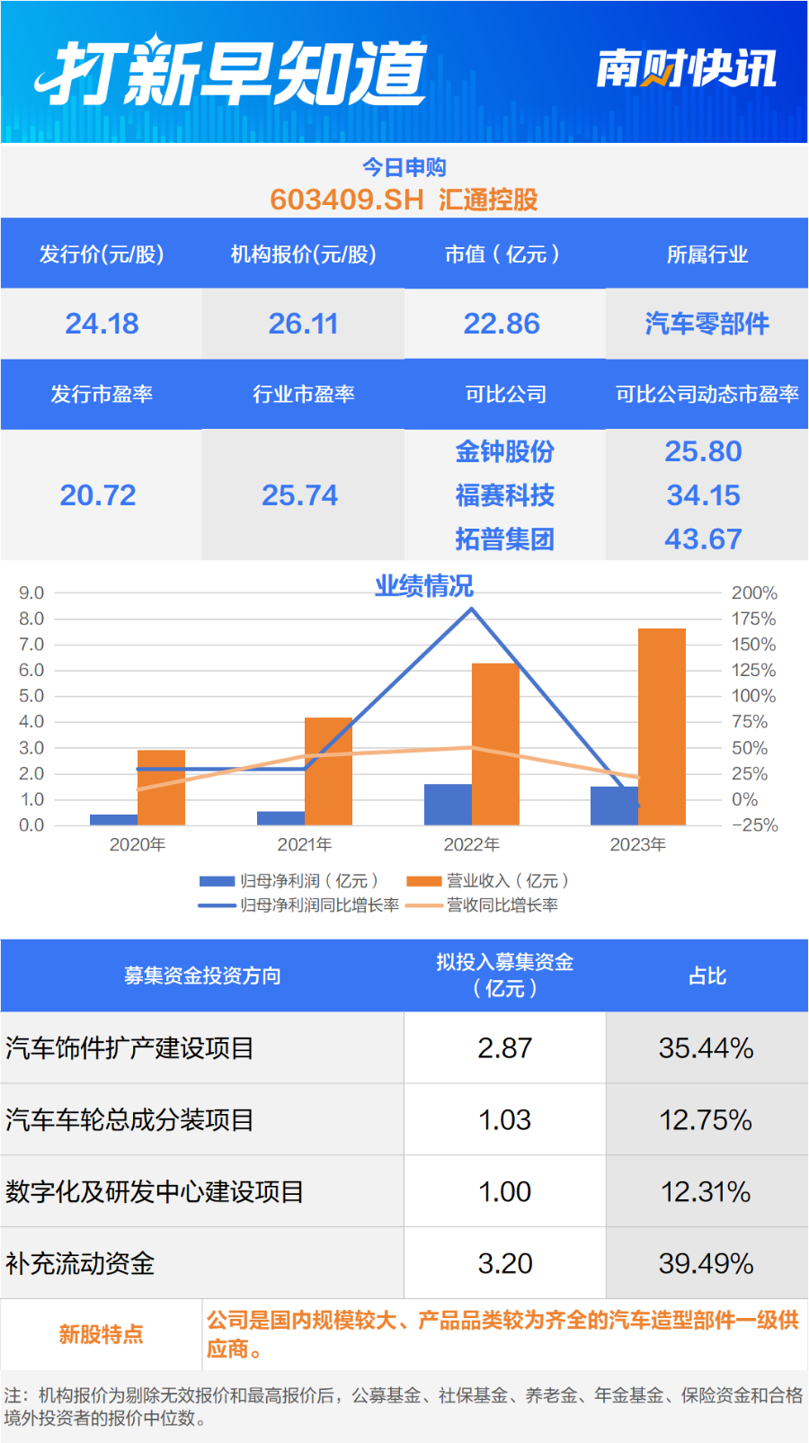 (原标题:奇瑞汽车、比亚迪的“小伙伴”,汽车零部件领域“小巨人”今日申购 | 打新早知道)