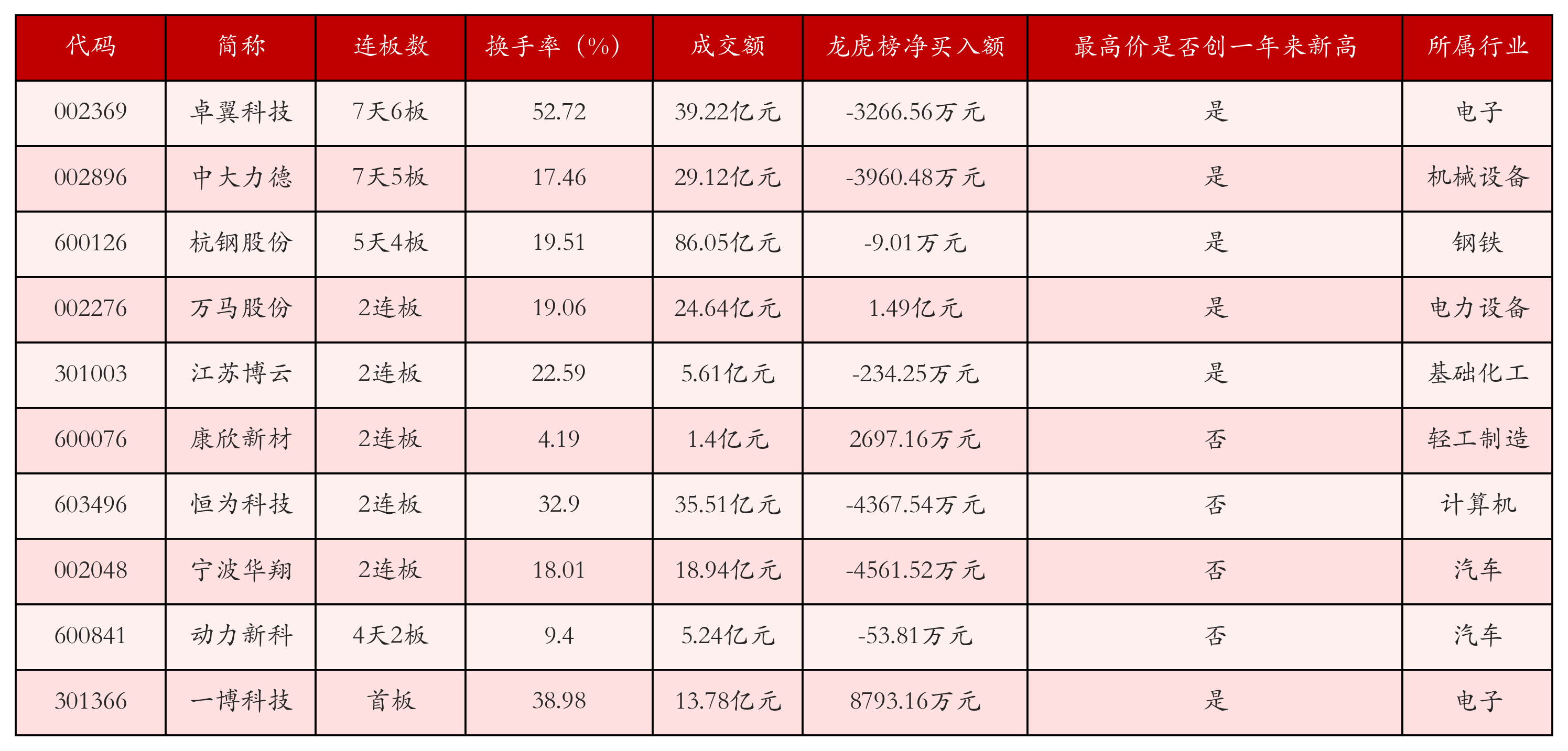 截至2月27日收盘,上证综指上涨0.23%,收于3388.06点,深证成指下跌0.26%,收于10927.51点,创业板指下跌0.52%,收于2256.51点。今日沪深两市A股共计87只涨停,综合当前连板数以及当日龙虎榜数据,其中较为强势的前三只个股分别为:卓翼科技(002369)、中大力德(002896)与杭钢股份(600126)。今日强势个股前10位具体数据见下表: