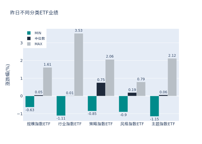 昨日股票型ETF收益率中位数为0.06%。其中按照不同分类,规模指数中南方中证2000ETF收益率最高,为1.61%;行业指数中国泰中证煤炭ETF收益率最高,为3.53%;策略指数中国泰上证国有企业红利ETF收益率最高,为2.06%;风格指数中富国中证价值ETF收益率最高,为0.79%;主题指数中博时上证自然资源ETF收益率最高,为2.12%。