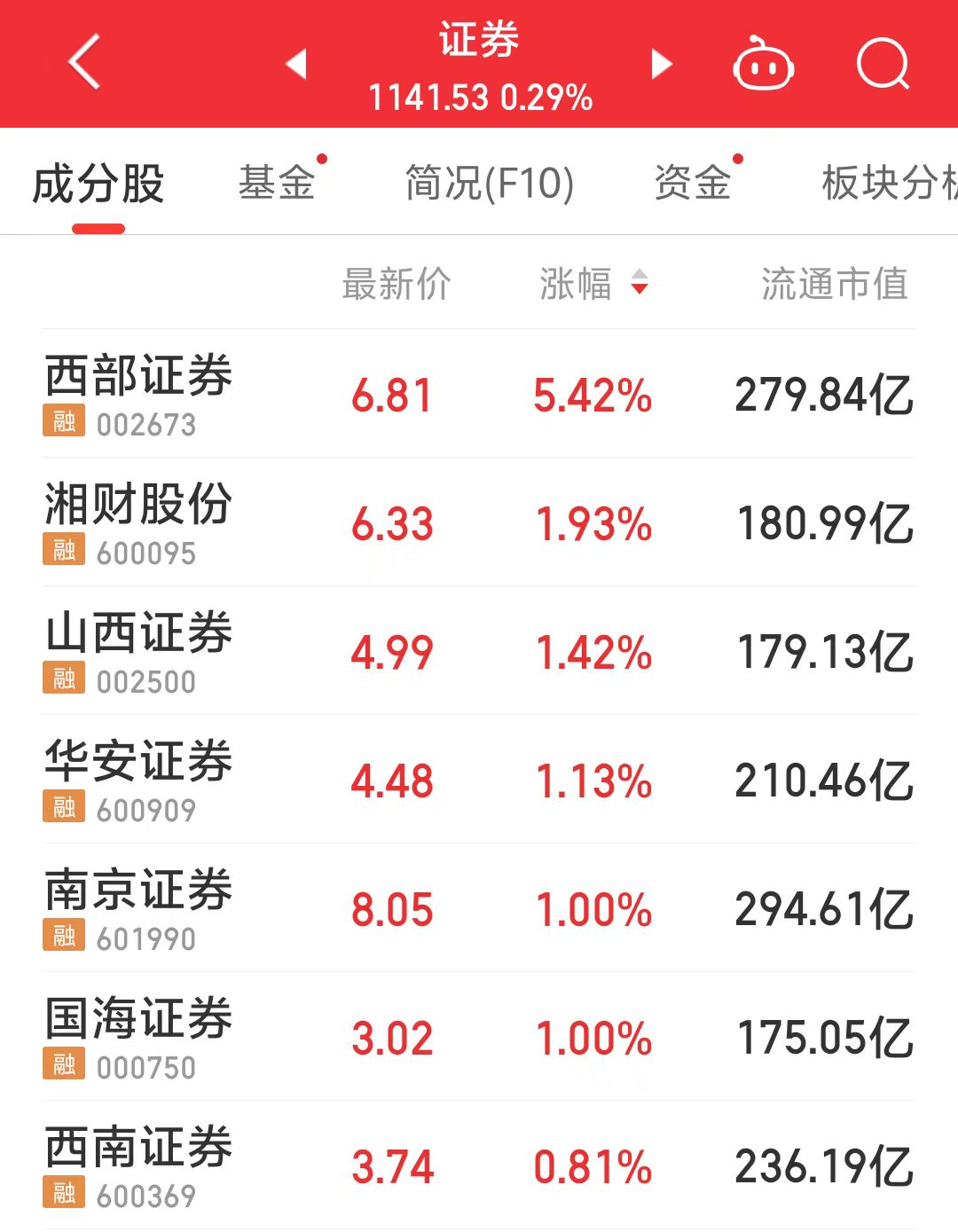 上述消息发布后,西部证券开盘并未一字涨停,而仅涨6.81%,截至10点47分,西部证券涨5.42%,湘财证券涨1.93%,山西证券、华安证券等跟涨。